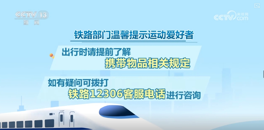 铁路部门温馨提示运动爱好者,出行时请提前了解携带物品的相关规定,如有疑问也可拨打铁路12306客服电话进行咨询,以免耽误您的行程。