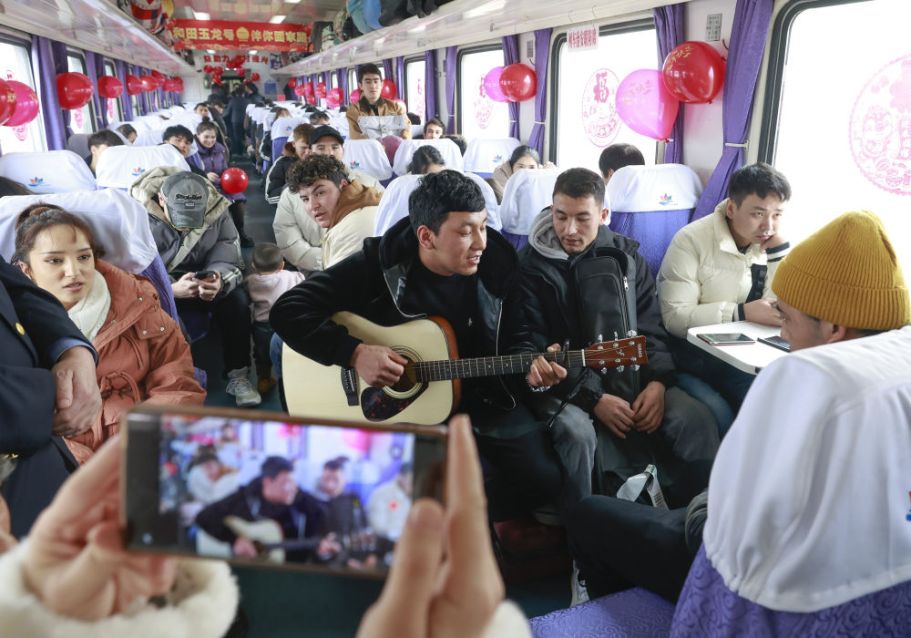 悠扬的琴声引起其他旅客的注意。得知还有人擅长弹琴,米尔阿迪力热情地递上自己的吉他,好几个手痒的旅客轮番献艺,听到柔情的民谣,不少人跟着哼唱起来。午后的阳光透进车窗,窗户上的“福”字映在旅客们的脸上。