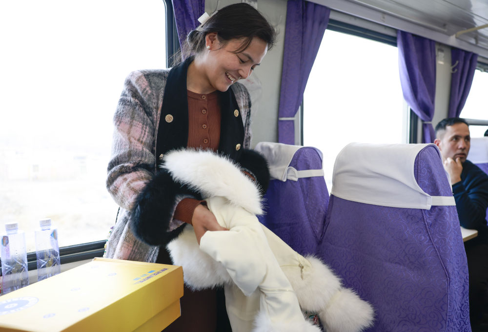这次坐车,布麦热姆发现了新变化:车厢的连接处贴上了对联,车窗上多了喜庆的窗花。“回家后帮我妈打扫卫生,再给她包个红包。”布麦热姆说,年味十足的车厢倒是提醒他,回家要抓紧备年货了。