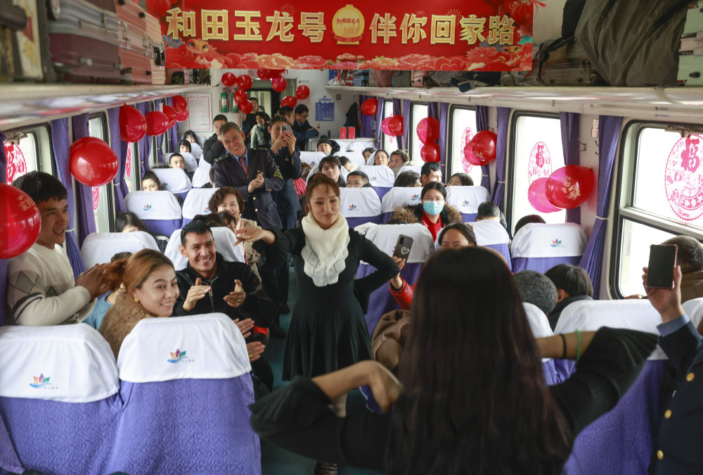 在7557次列车上,旅客随音乐跳起麦西来甫。新华社记者 王菲 摄