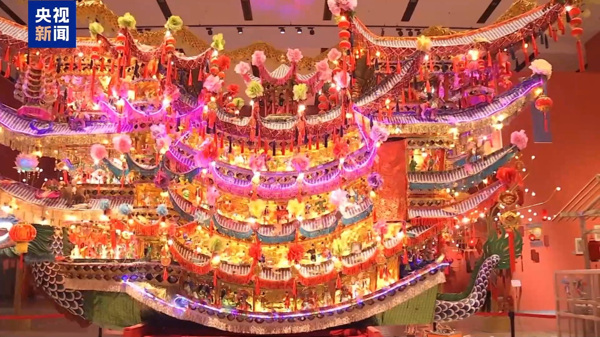 进入彩门楼,写春联、印年画、投壶等传统年俗,让浓浓的年味儿扑面而来,热闹的乡村大舞台、流光溢彩的花灯让人目不暇接。其中来自浙江乐清的首饰龙,是馆内单体最大的花灯,春节期间,当地百姓会抬着“首饰龙”游街串巷,承载着为家家户户祈求平安的美好寓意。
