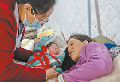 1月10日,日喀则市定日县人民医院妇产科医生在照看一对母子。这名新生儿在9日刚刚出生。人民日报记者 张武军摄