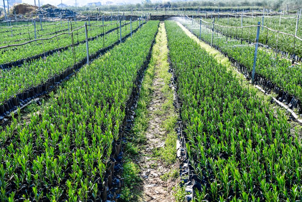 在四川冕宁县元升油橄榄产业园,自动喷淋系统在为培育中的油橄榄树幼苗浇水(2024年12月12日摄)。新华社记者 张超群 摄