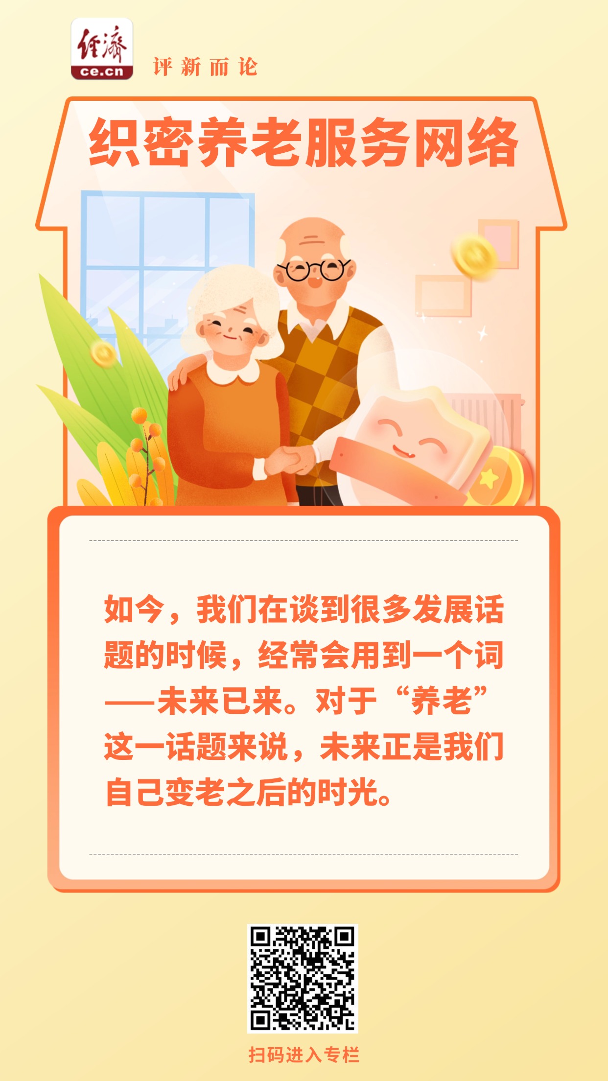 如今,我们在谈到很多发展话题的时候,经常会用到一个词——未来已来。对于“养老”这一话题来说,未来正是我们自己变老之后的时光。随着社会老龄化程度加深,养老需求真实地摆在每一个人面前。从这个意义上来看,一个健全的养老服务体系就不只是对老年人的托底,更是对每一个人生命历程的敬畏与珍视。(中国经济网评论员 臧梦雅)