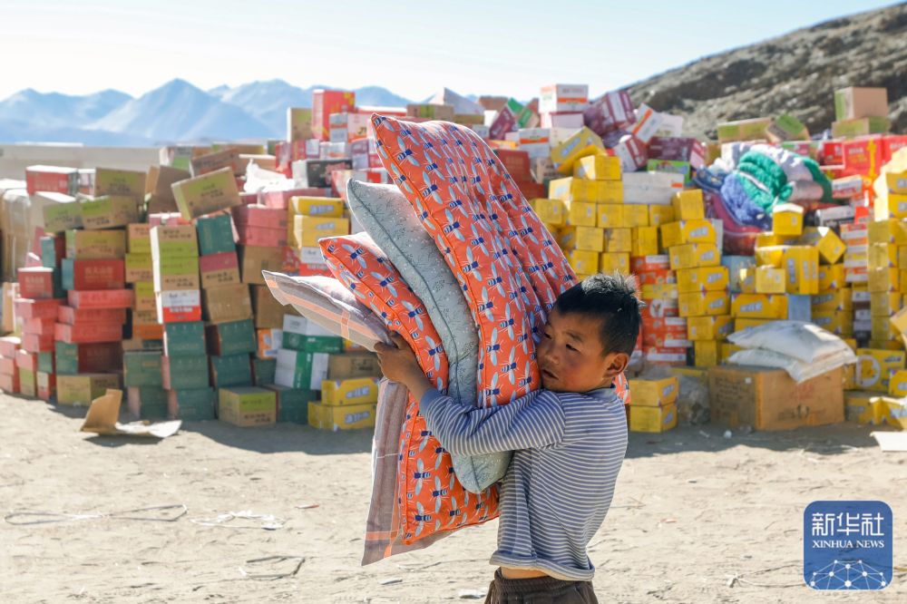 1月10日,在定日县长所乡古荣村,一名男孩抱着领取到的过冬物资,从临时安置帐篷搬入板房。