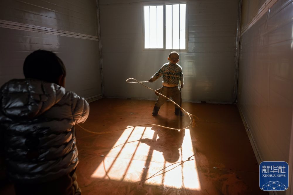 1月10日,在定日县长所乡古荣村,两名小朋友在板房内玩耍。