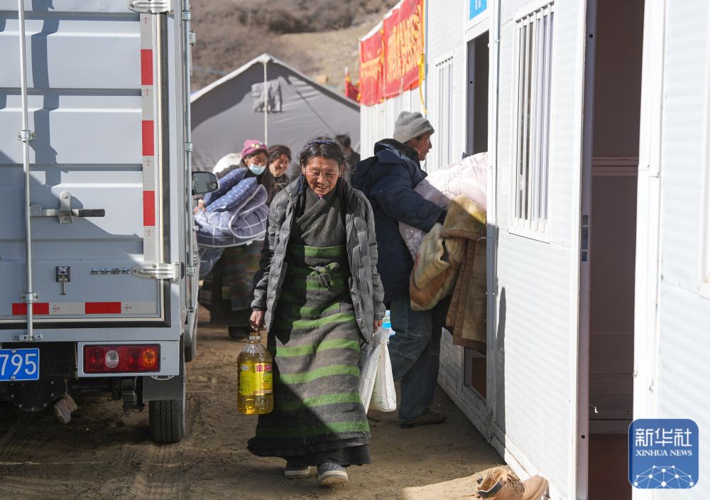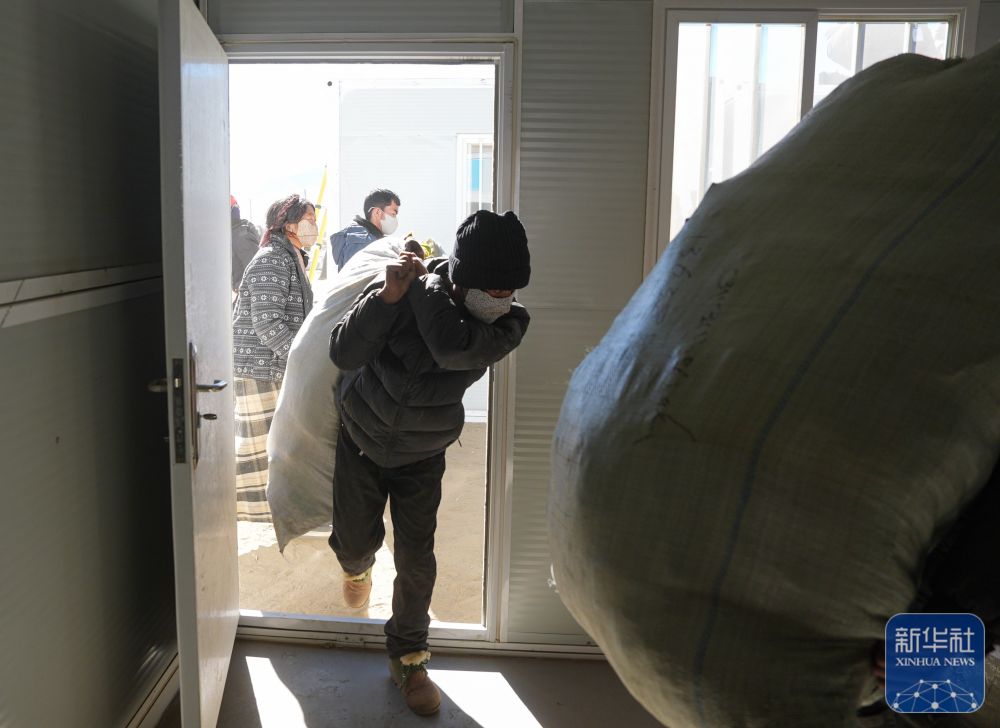 1月10日,在定日县长所乡古荣村,受灾群众将过冬物资从临时安置帐篷搬入板房。