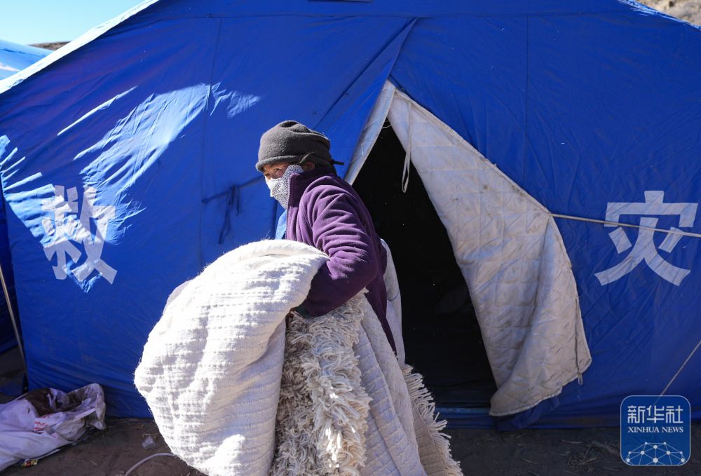 1月10日,在定日县长所乡古荣村,受灾群众准备将个人物品从临时安置帐篷搬入板房。