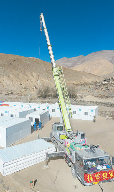 为保障受灾群众从应急性临时安置转为固定性过渡安置,震后第二天,首批新式折叠板房就运抵定日县。
