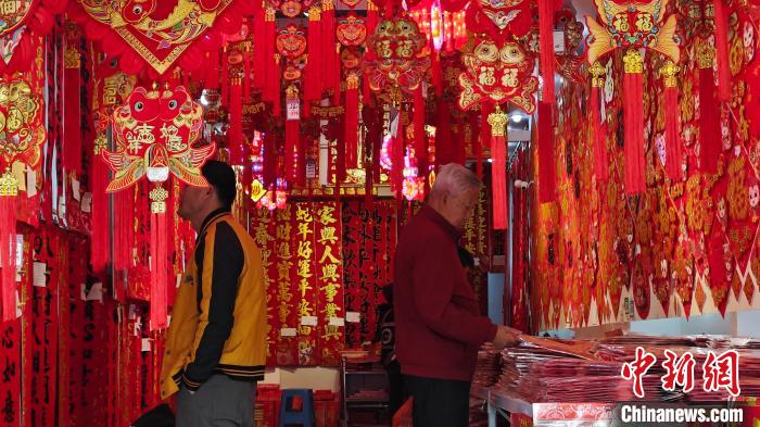 1月8日,临近春节,海口百年骑楼老街年味十足。图为民众在选购贺年装饰等年货。沈南 摄