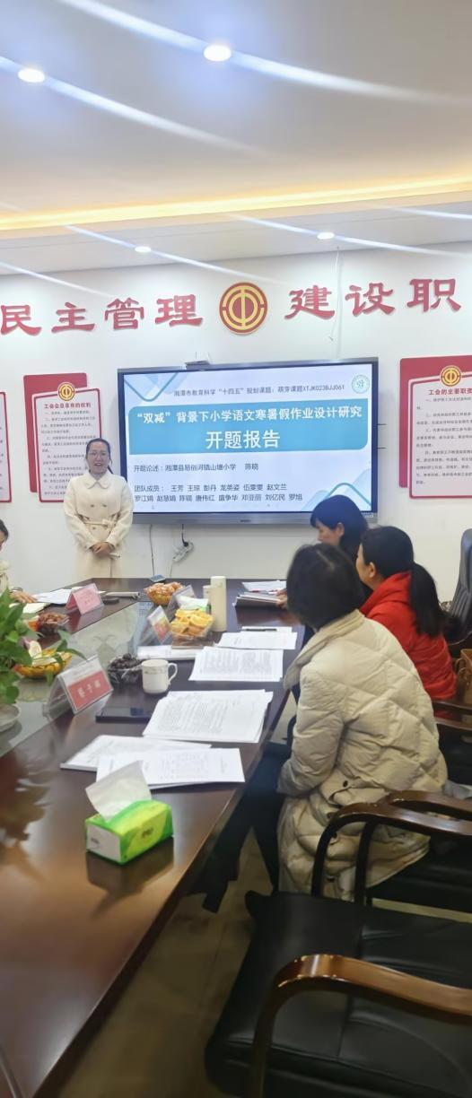 华声在线1月6日讯(通讯员 彭丹)为了落实“双减”政策,提升学生的核心素养和教师的专业能力,湘潭县易俗河镇山塘小学语文课题成功申报湘潭市教育规划课题,并于 2024年12月12日在湘潭县天易水竹学校进行开题论证。活动由湘潭县中小学教研室组织,陈红、蔡子辉、周建兵、赵特等专家领导莅临指导课题工作,湘潭县中小学教研室周建兵主任主持。