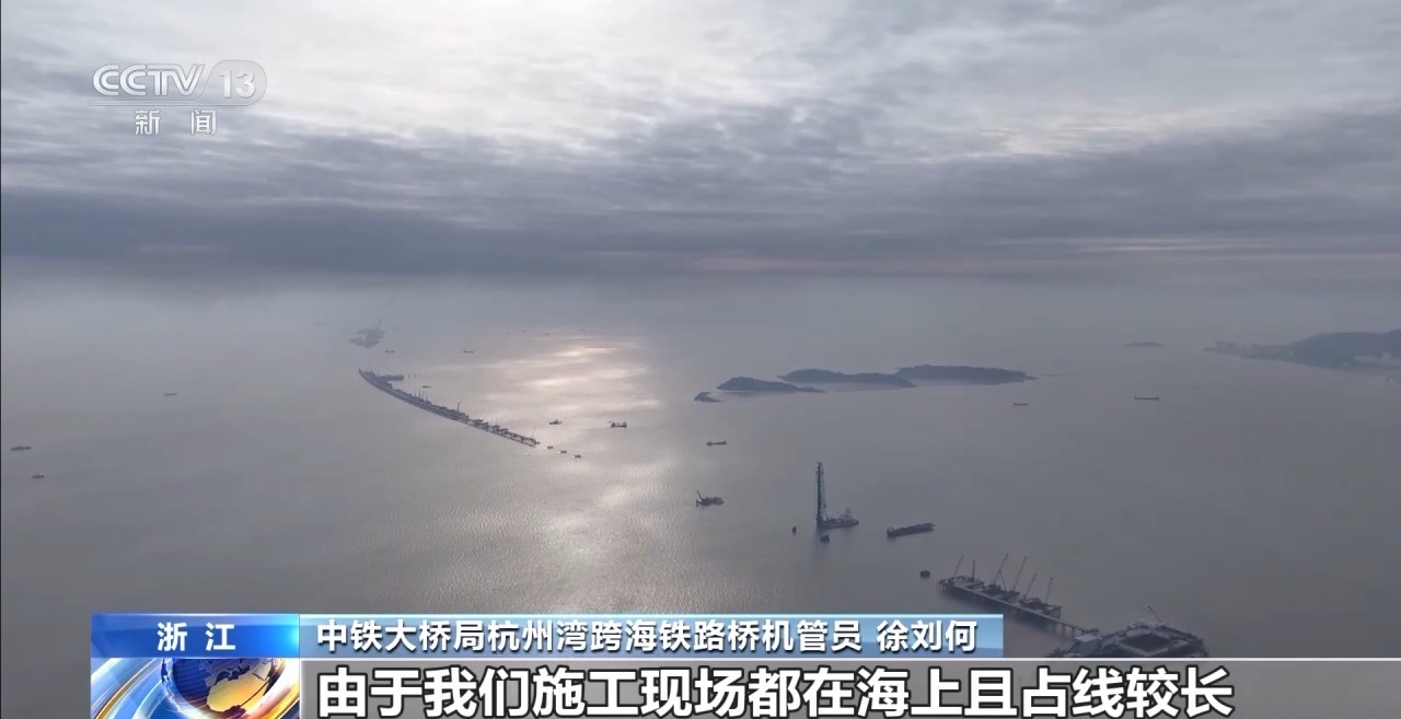 在浙江杭州湾海域,1600多名建设者正在杭州湾跨海铁路大桥进行大桥水下基础和桥墩墩身的施工。
