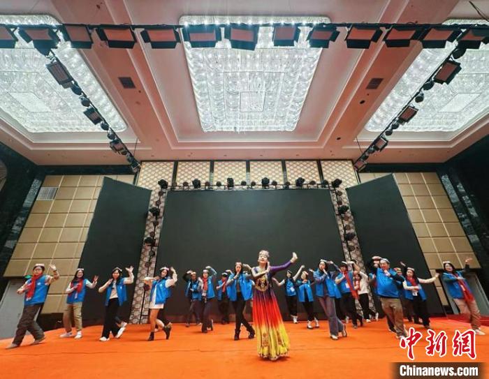 图为参加交流团的香港青年(蓝衣)跟随当地民众学习新疆特色舞蹈。 主办方 供图