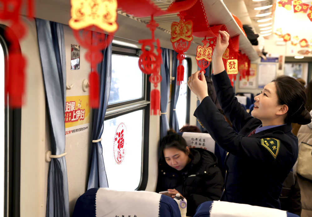 1月14日,列车工作人员在装饰车厢。新华社发(王旺旺摄)