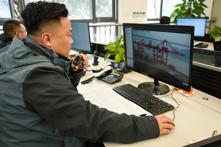1月29日,调度员耿杰在重庆果园港集装箱公司生产调度指挥中心内值班。新华社记者 田金文 摄