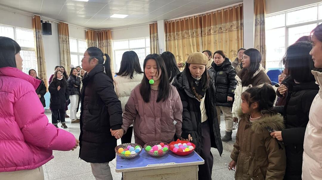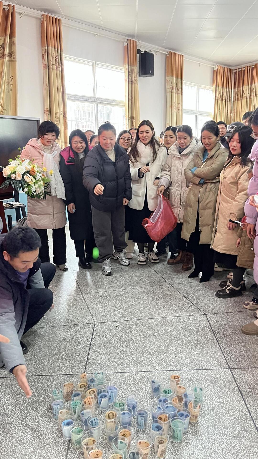 第一个游戏是“投元宵”,参与者站在指定点将小球投向装有不同金额的杯子中。游戏不仅考验了参与者的技巧,带来了阵阵欢笑和惊喜,更体现了学校的人文关怀。第二个游戏“传元宵”则要求5-10人一队,成员背对背围圈,用勺子舀起乒乓球,手拉手穿越会议室,最终将球放入终点的小桶中。这不仅考验了集体的协作能力,增强了同事之间的默契,也增进教师团队凝聚力。活动最后,学校为每位参与者准备了节日纪念品,大家在一片欢声笑语中结束了本次愉快的活动。