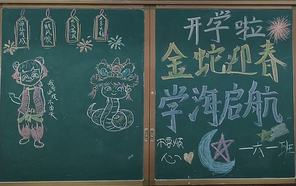 在各班教室里,新学期的黑板报让人眼前一亮。《哪吒2》中哪吒、敖丙的形象被搬到黑板上,活灵活现。“若前方无路,我便踏出一条路!”电影中励志的话语,让孩子们动力满满。