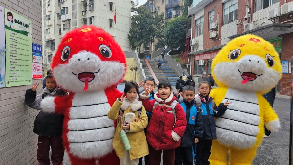“蛇宝来啦!”开学日的校门口,象征着好运、吉祥的生肖蛇宝迎接每一位师生家长的到来。同学们兴奋地与“蛇宝”们合影,开启元气满满的新学期。