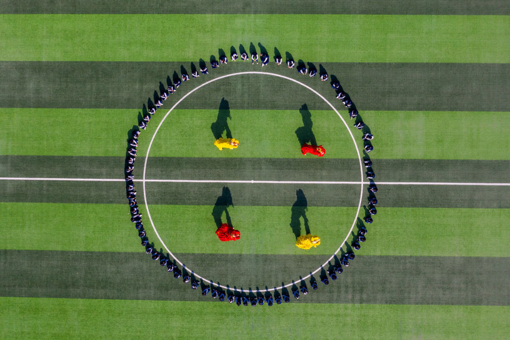 2月14日,山东省淄博科技学校龙狮社团的学生在操场上进行舞狮演练(无人机照片)。新华社发(张维堂摄)