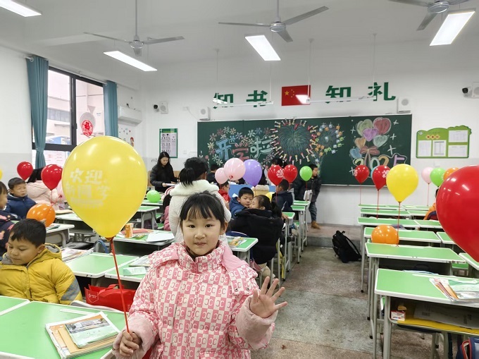 教室里,老师们以满满的巧思与爱意,利用有限的空间,发挥无限的想象力,为孩子们打造了一场仪式感十足的开学盛宴。映入眼帘的是整齐如列队的课桌,黑板上,迎新年的创意标语灵动跃动,缀以蜿蜒的蛇形彩绘与祥云图案,寓意智慧与好运绵延相伴。窗边垂挂的流苏灯笼、桌面精巧的剪纸,还有写上“平安·喜乐”祝福卡,色彩斑斓的彩带气球,让教室每一处都流淌着温暖的新年气息。
