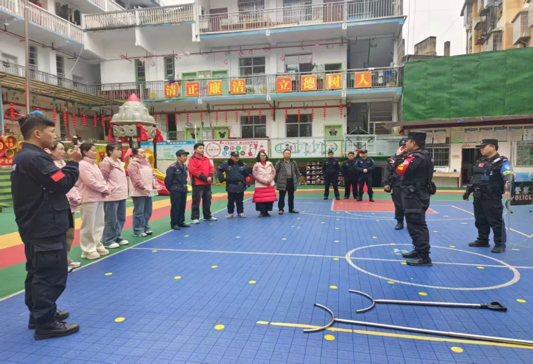 演练当日,一名“歹徒”佯装家长,试图强行闯入幼儿园。安保人员迅速察觉异常,立即按下一键报警装置,同时持防暴器械与“歹徒”周旋。老师们闻声而动,迅速组织幼儿有序撤离到教室,紧闭门窗,用桌椅堵住门口,安抚幼儿情绪。短短1分钟,派出所民警与巡特警队员便赶到现场,凭借专业战术,成功制服“歹徒”。