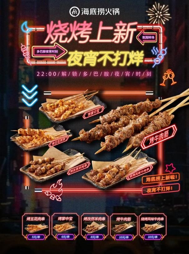 除推出烤串新品之外,上海海底捞的部分门店还推出了提拉米苏甜品,黑糖珍珠大红袍、绵糯芋泥大红袍等饮品。不仅如此,海底捞在北京西路店推出了夜宵主题店,每晚10点后,门店不仅提供火锅与烧烤的美味组合,还增设花式调酒表演和打酒站,为消费者打造独特的微醺夜生活体验。
