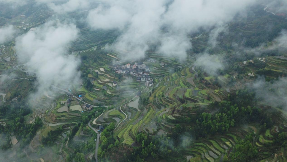 肇兴侗寨内,古朴别致的吊脚楼掩映在青山绿水间。