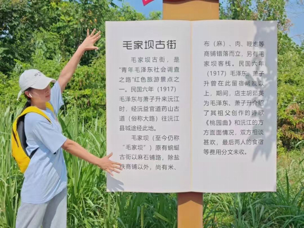 队员们漫步在古街的麻石路上,指尖轻抚着被往来脚步磨得光滑的石板,仿佛穿越回了那个动荡却充满理想的年代。据记载,当年的毛家坝古街热闹非凡,盐铁、米、布、肉、鞭炮等商铺错落分布,还有一家毛家坝客栈。伟人与萧子升曾数夜留宿于此,店主胡茹英不仅热情地向他们介绍祖父创作的诗歌《桃园曲》,还细致讲述了沅江的风土人情、民生百态,两人相谈甚欢。临别时,胡茹英更是分文未收他们的食宿费用,这份淳朴的情谊,如同古街的青石板一般,深深镌刻在历史的记忆里。