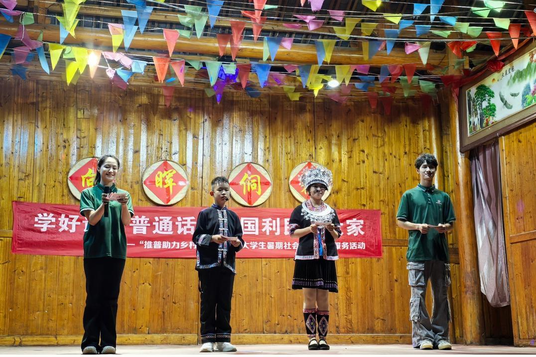 200余份问卷、30余次入户访谈,“语润会同”团队通过深入调研精准绘制出当地语言能力“画像”——50岁以上村民普遍存在方言交流障碍,青少年普通话发音不规范。为此,团队运用“分层教学法”,对中老年村民开展“一对一”情景对话辅导,为儿童设计“声音明信片”“绕口令擂台”等趣味课程。与此同时,在“金声”工作室团队特训下,侗族学生杨宇博、杨语晴从怯场到自信登台,在联谊晚会上用标准普通话朗诵《红色的七月》《祖国啊,我为你自豪》等作品,展现推普成效。“语言扶贫就是要让每个村民都能‘敢开口、会表达’”。带队教师黄静介绍,团队还创新“小手拉大手”模式,通过孩子带动家长学习,形成推普长效机制。