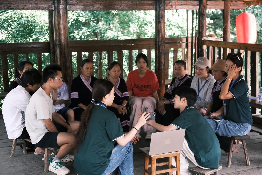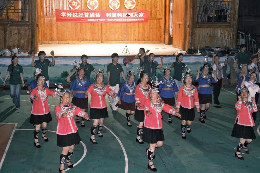 在靖州岩脚侗寨,“语润寨牙”团队创新“非遗+推普”模式,非遗传承人杨师傅现场展示侗族琵琶制作技艺,队员们则用普通话讲述“丝路女儿国”的传说与侗族风雨桥的前世今生。通道侗族自治县向晖村的联谊晚会上,侗族芦笙演奏《北京的金山上》与儿童合唱《明天会更好》相映成趣,最后的“哆耶舞”将村民与队员的手紧紧相连。团队还系统记录下侗族银器、苗族刺绣等200余件珍贵非遗影像素材。“推普不是要取代方言,而是搭建沟通桥梁。”靖州分队学生领队黄诗婕深有感触。