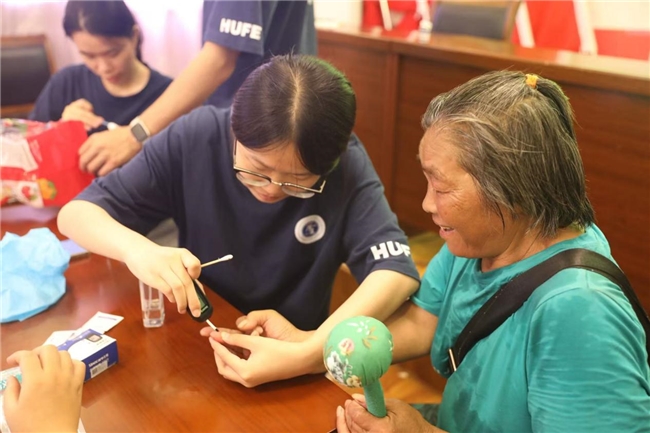 培训结束后,在当地卫生所工作人员的科学指导下健康义诊活动随即展开。队员们悉心搀扶行动不便的老人,为到场的老人们逐一进行血压、血糖检测,并科普日常管理知识。一位刚刚完成检测的大伯高兴地说:“这些伢子妹子真贴心,手把手教我们测血压血糖,还讲得清清楚楚,真周到哩!”。另一位奶奶也感慨道:“平时去趟镇上医院不容易,今天在家门口就能检查身体,还学了这么多照顾自己和老伴的法子,心里踏实多了!”