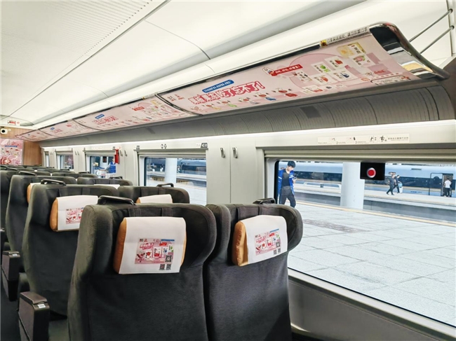 果板牌果冻将品牌元素融入每一列充满活力的粉色专列,将高铁的每一个角落——从车身的醒目Slogan,到车内小桌板、头枕巾、行李架的细节呈现,再到车内海报的视觉冲击,全方位、多维度地构建起沉浸式的品牌体验空间。