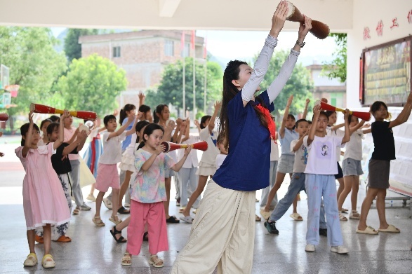 华声在线8月1日讯(通讯作者 黄振峰)7月20日,永州市江华瑶族自治县大圩镇第二小学的文艺汇演舞台上,清脆的“咚比——咚比——”鼓点与孩子们的舞步相映成趣。这些小舞者均来自中南大学建筑与艺术学院“山那边”文艺支教团开设的长鼓舞特色课堂。台下,授课教师陈佳怡笑意里藏着欣慰。