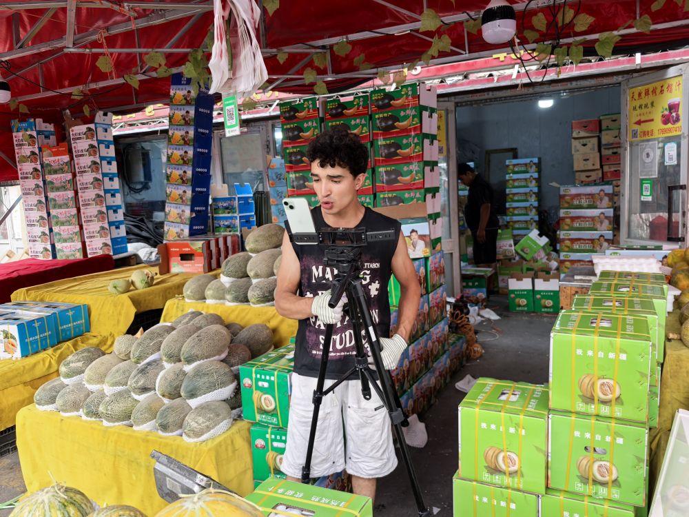 7月29日,新疆一家水果商户正在直播销售老汉瓜。新华社记者张瑜 摄