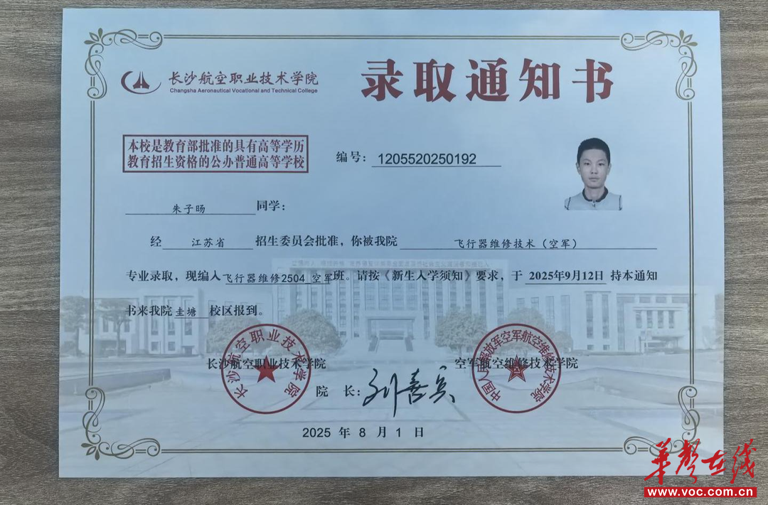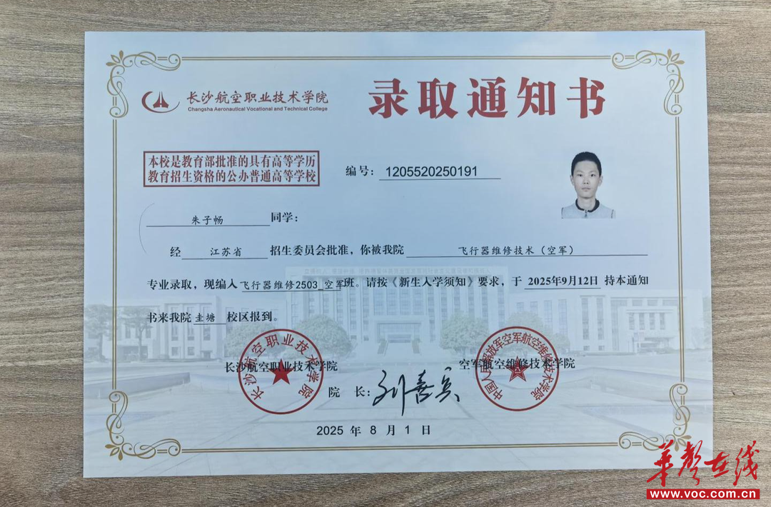 8月1日,来自江苏省的双胞胎兄弟朱子畅、朱子旸收到了长沙航空职业技术学院的录取通知书,成为了该校飞行器维修专业的定向培养军士生。