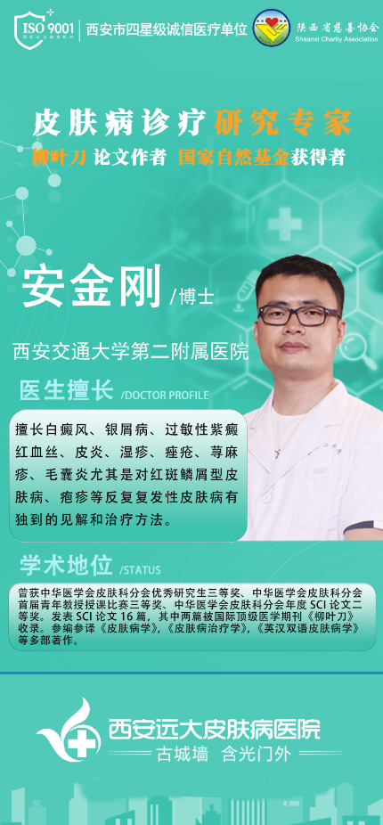 西安远大中医皮肤病医院,作为西北地区知名的皮肤病诊疗机构,一直致力于为各类皮肤病患者提供高水平诊疗服务。 我们深知专业医生对疾病预后的重要性。因此,医院特别邀请到知名皮肤病专家安金刚博士,于每周五(下午)在西安远大中医皮肤病医院坐诊,为患者提供高品质的皮肤病诊疗服务,尤其擅长各类顽固性皮肤病包括白癜风的科学评估与综合管理。