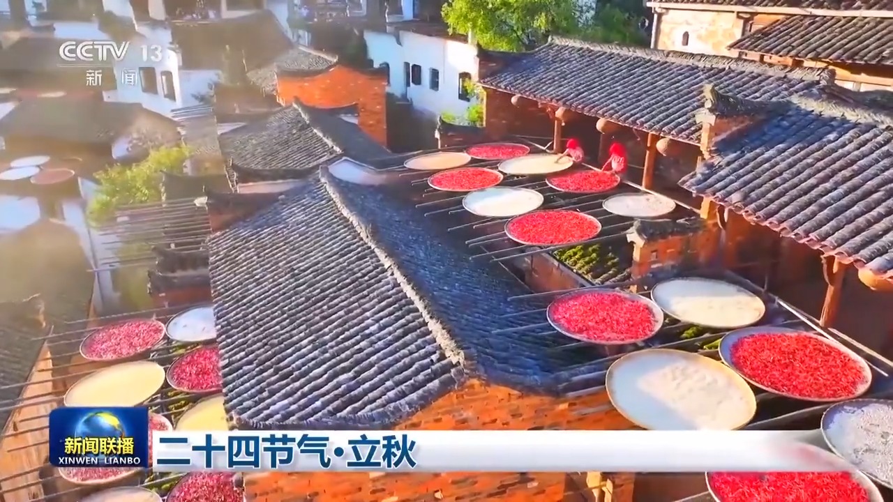 立秋至,晒秋忙。人们利用房前屋后晾晒农作物,色彩斑斓,既是风俗,也是风景。