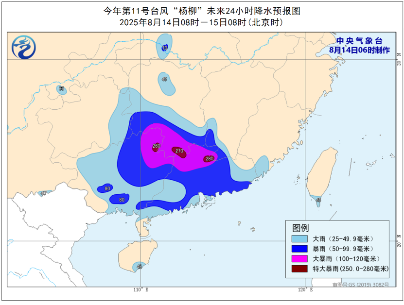 预计,8月14日08时至15日08时,广东大部、广西大部、福建东南部、江西南部、湖南中南部和西北部、贵州东部等地有大到暴雨,部分地区大暴雨,其中,广东北部、广西东北部、湖南南部、江西西南部等地局地有特大暴雨(250~280毫米)。上述部分地区伴有短时强降水(最大小时降雨量20~50毫米,局地可超过70毫米),局地有雷暴大风等强对流天气。