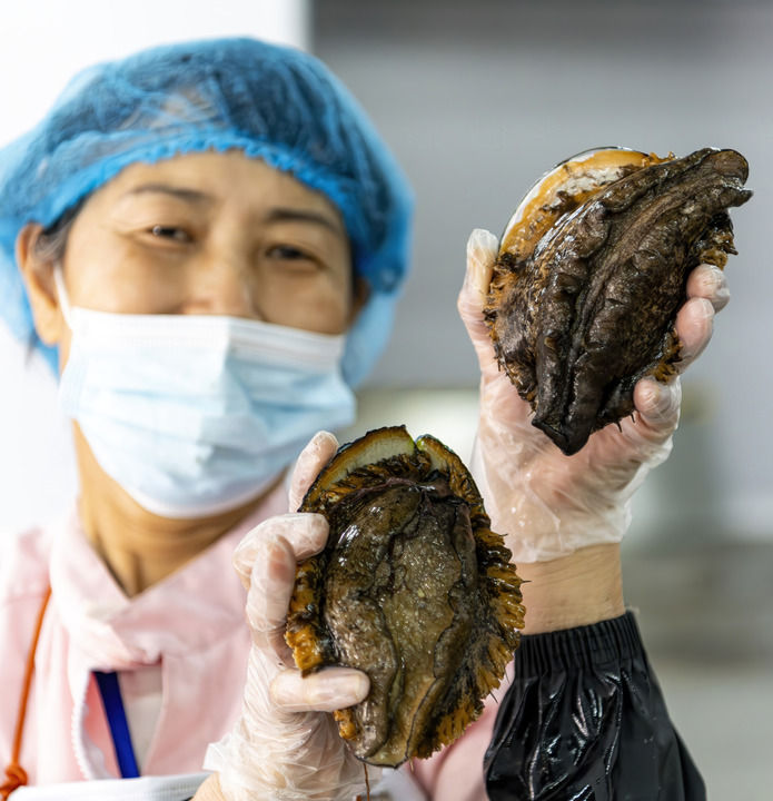 2025年5月16日,在位于福建莆田市涵江区的福建省新膳海洋食品有限公司,工人展示超大规格活鲍鱼。新华社记者 魏培全 摄