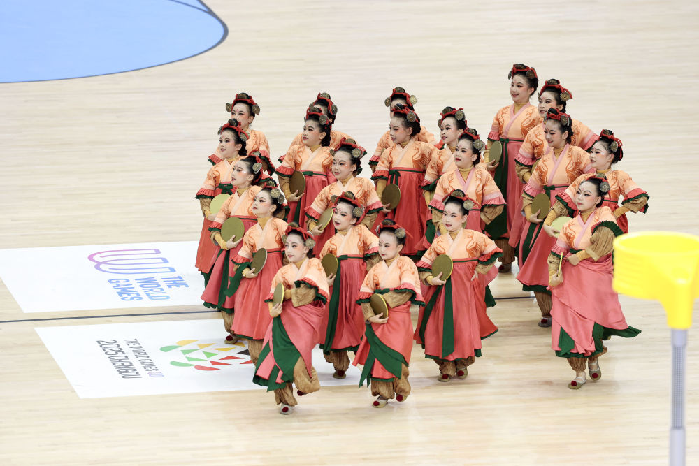 ↑8月12日,演员在成都世运会荷球混合团体赛决赛铜牌赛间隙进行杂技表演。