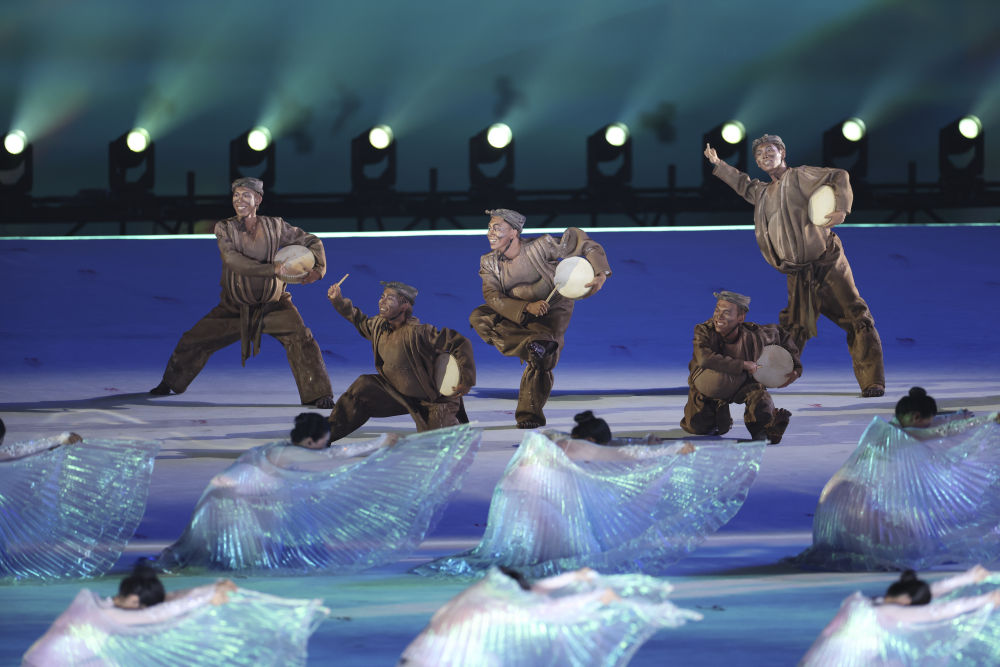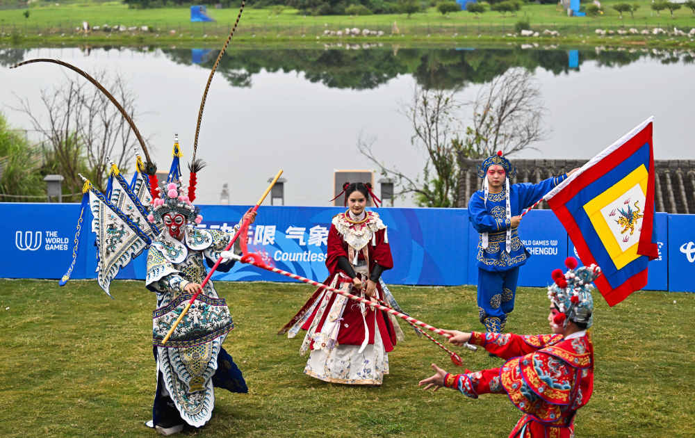 ↑8月8日,演员在成都世运会射准射箭复合弓混合团体决赛颁奖仪式前表演川剧。