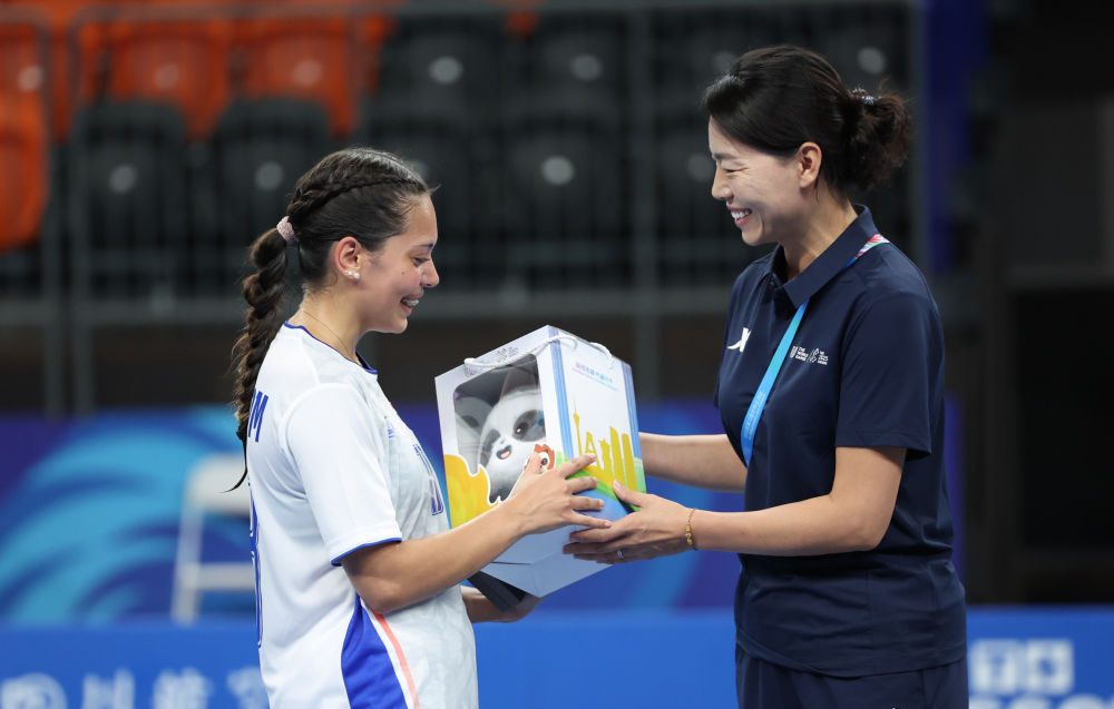 ↑8月12日,冠军阿根廷队球员在成都世运会女子沙滩手球颁奖仪式上落泪。