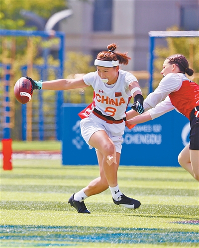中国队运动员(左)在腰旗橄榄球比赛中。