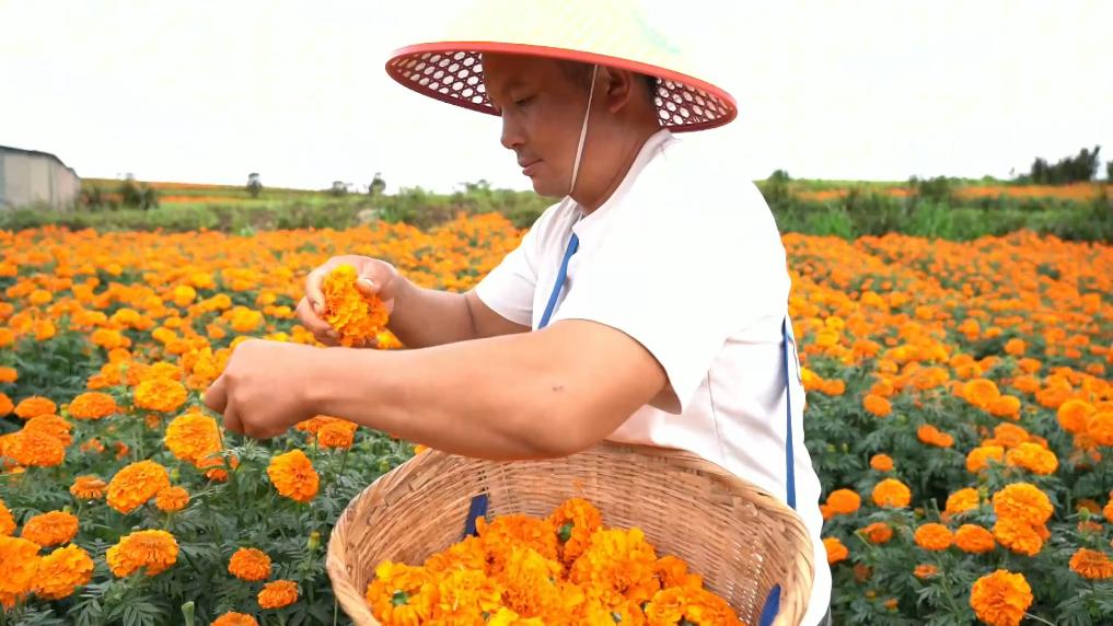 近日,在云南省蒙自市,金黄的万寿菊迎来丰收期。花农们正穿梭在田间,娴熟地采摘着花朵。