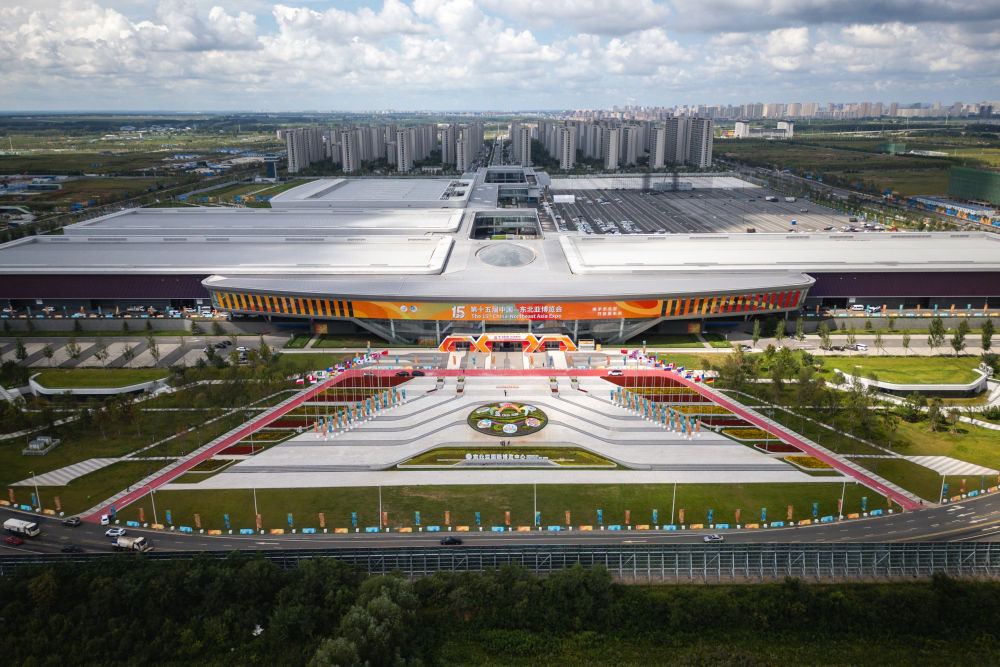 这是2025年8月26日拍摄的第十五届中国—东北亚博览会展馆外景(无人机照片)。新华社记者 许畅 摄