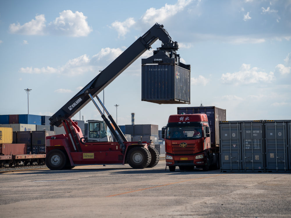 2025年7月14日,长春兴隆铁路口岸作业区内的吊装车将集装箱装载到卡车上。新华社记者 邵泽东 摄