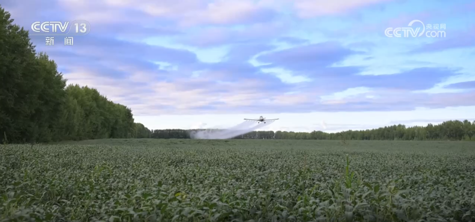 在黑龙江北大荒二九〇农场的万亩大豆片,固定翼飞机正在开展“一喷多促”作业。今年,农场建成200套物联网设备,适时监测大豆长势,根据营养所需实现精准控肥。农场负责人表示,今年“一喷多促”面积达到14万亩,数智化技术应用后,生产效率提升6%。