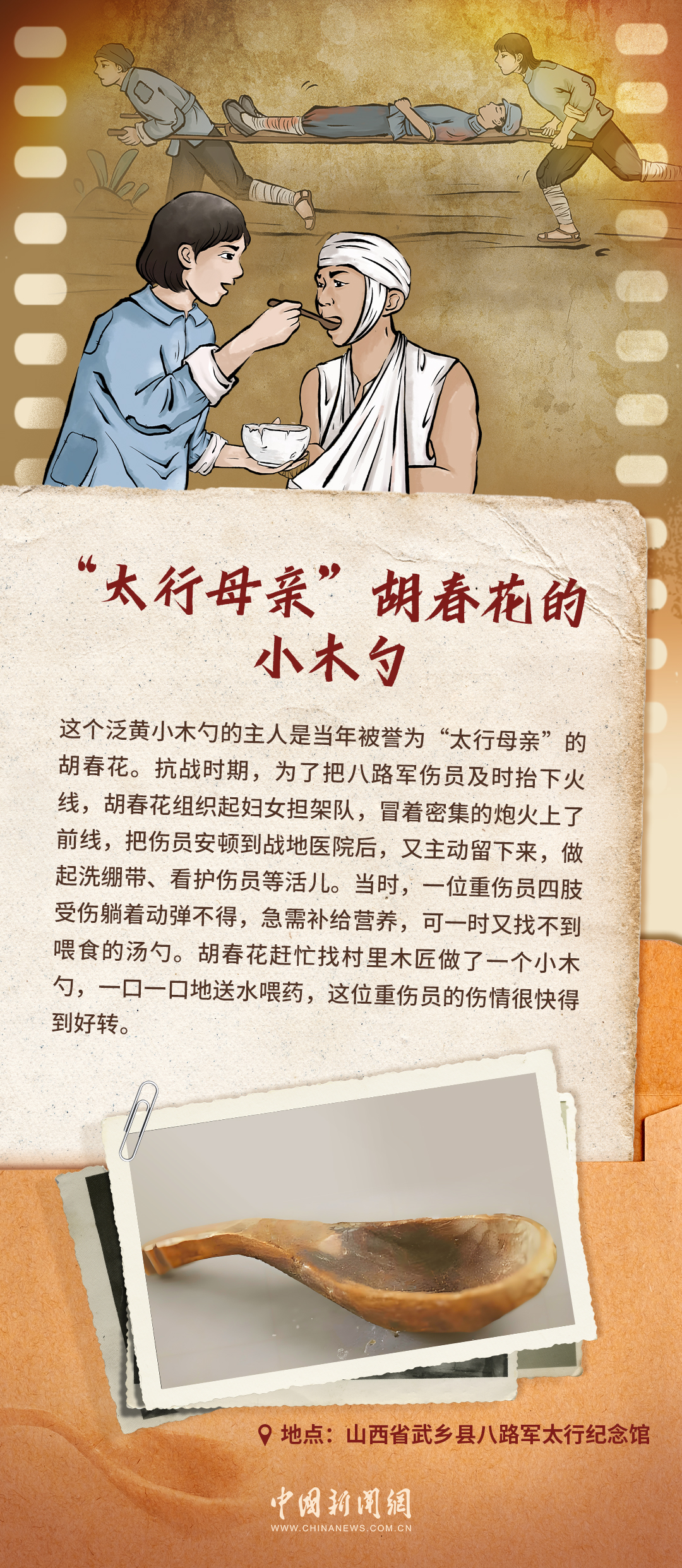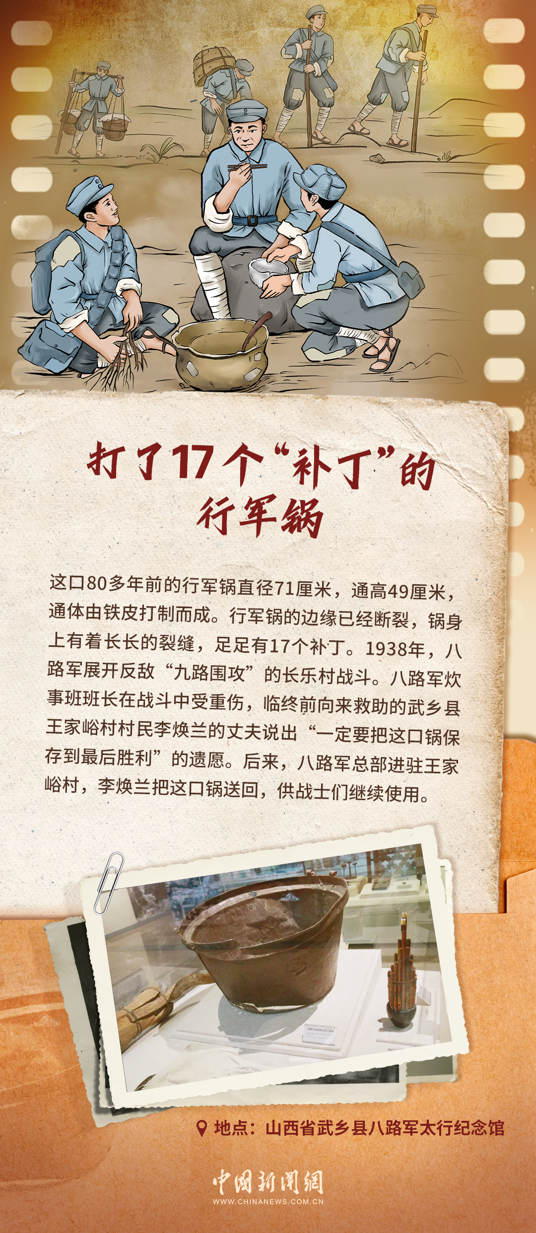 一把小木勺,胡春花用它为伤员一勺勺喂药喂饭;一方煎饼鏊,邓玉芬用它为战士们烙饼充饥;一口行军锅,打了17个补丁仍在使用,铁锅里的每一道裂缝,都记录着军民鱼水情的温暖……这些斑驳的物件,藏着血肉铸就的抗战史诗,诉说着那段艰苦岁月里最动人的温情故事。
