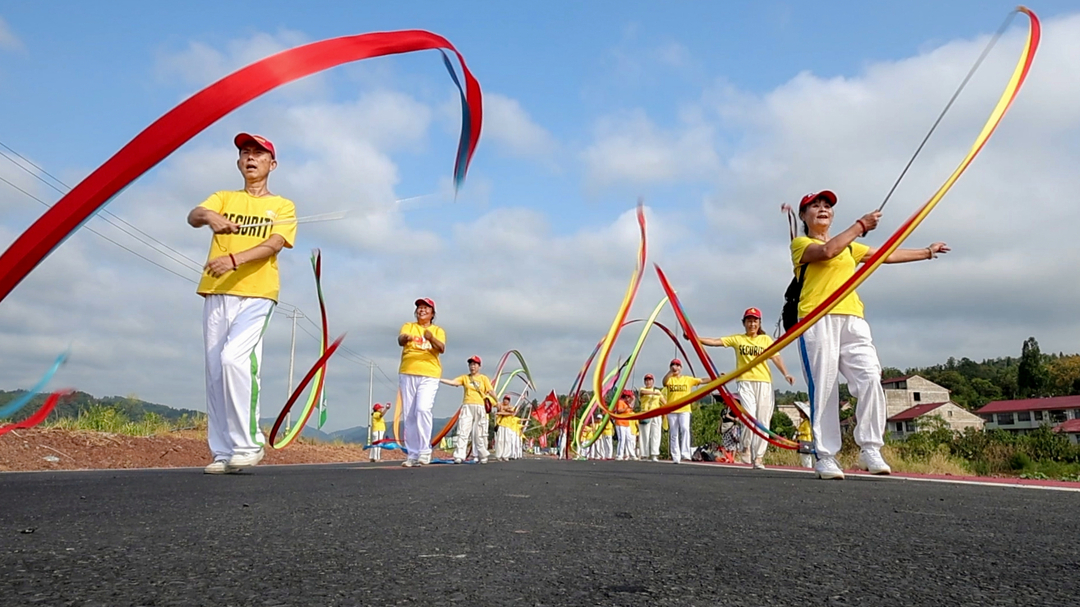 群众挥舞彩带欢庆公路通车。(邓浩然 摄影)