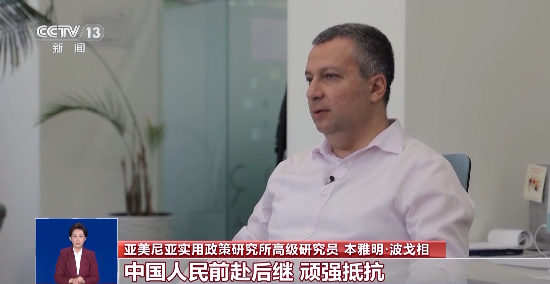 亚美尼亚实用政策研究所高级研究员 本雅明·波戈相:自20世纪30年代初起,中国就展开了艰苦卓绝的抗日战争。中国人民前赴后继、顽强抵抗、付出巨大牺牲,为人类最终战胜法西斯势力作出不可磨灭的贡献。我们应当永远铭记中国和反法西斯同盟国取得的伟大胜利,历史不仅需要被铭记,更需要从中汲取教训。